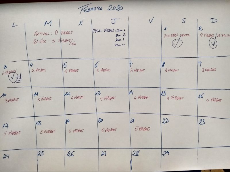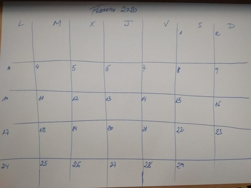 Vamos paso a paso: Haz un calendario «especial» del mes de febrero con tus metas a conseguir y dedícale unos minutos a la semana (pueden ser en un día o repartidos) a ir chequeando tus compromisos contigo mism@. Éste puede ser un ejemplo, tiene que ser funcional, el nivel de belleza lo dejo en vuestras manos.